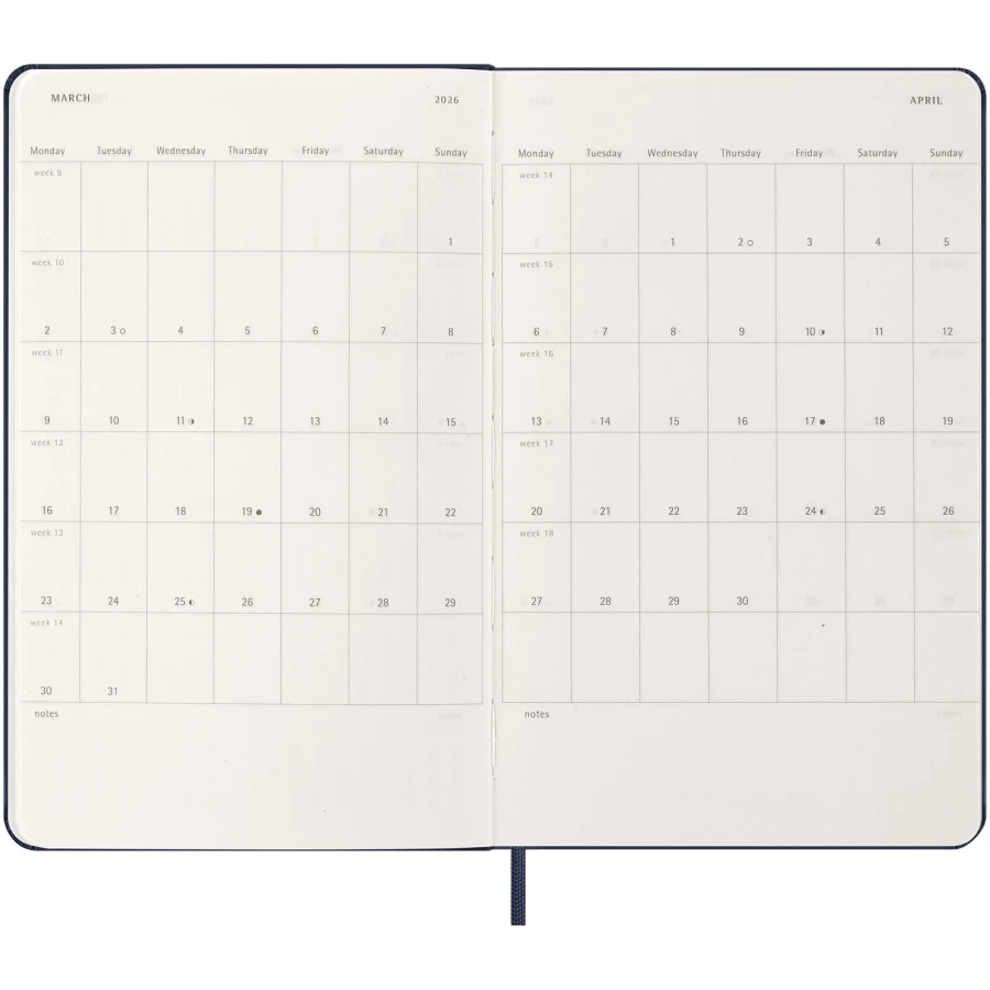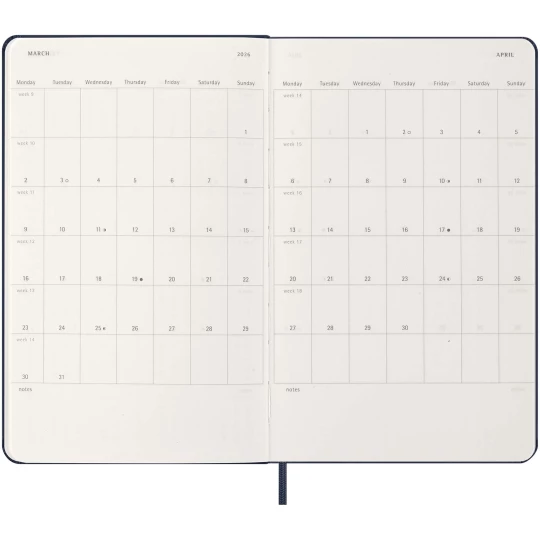 Zaplanuj każdy dzień w najdrobniejszych szczegółach za pomocą 12-miesięcznego kalendarza Moleskine w twardej oprawie. Ten kalendarz obejmujący okres od stycznia do grudnia 2026 r., jest sformatowany w taki sposób, aby na każdej stronie znajdował się cały dzień, co zapewnia mnóstwo miejsca na zapisywanie wydarzeń, spotkań, zadań do wykonania, przypomnień i planów. W ciągu roku staje się on fizycznym zapisem wszystkiego, co udało Ci się osiągnąć, dzień po dniu. Zawiera bezkwasowy papier w kolorze kości słoniowej, czarne elastyczne zamknięcie, wstążkę do zaznaczania stron, kolorową rozszerzalną kieszeń wewnętrzną i naklejki do personalizacji, a także naklejki z rokiem na grzbiecie.
