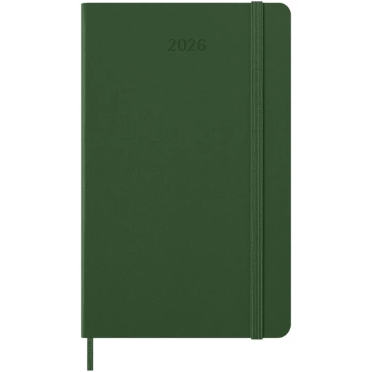 12-miesięczny kalendarz tygodniowy Moleskine w twardej oprawie, obejmujący okres od stycznia do grudnia 2026 r., pokazuje w skrócie cały tydzień, jak również zawiera roczne i miesięczne strony przeglądowe oferujące lepszy podgląd roku oraz strony na planowanie podróży, zapisywanie pomysłów i celów. Dni każdego tygodnia są pokazane po jednej stronie obok strony w linie z miejscem na zadania i notatki. Zawiera bezkwasowy papier w kolorze kości słoniowej, czarne elastyczne zamknięcie, wstążkę do zaznaczania stron, kolorową rozszerzalną kieszeń wewnętrzną i naklejki do personalizacji, a także naklejki z rokiem na grzbiecie.