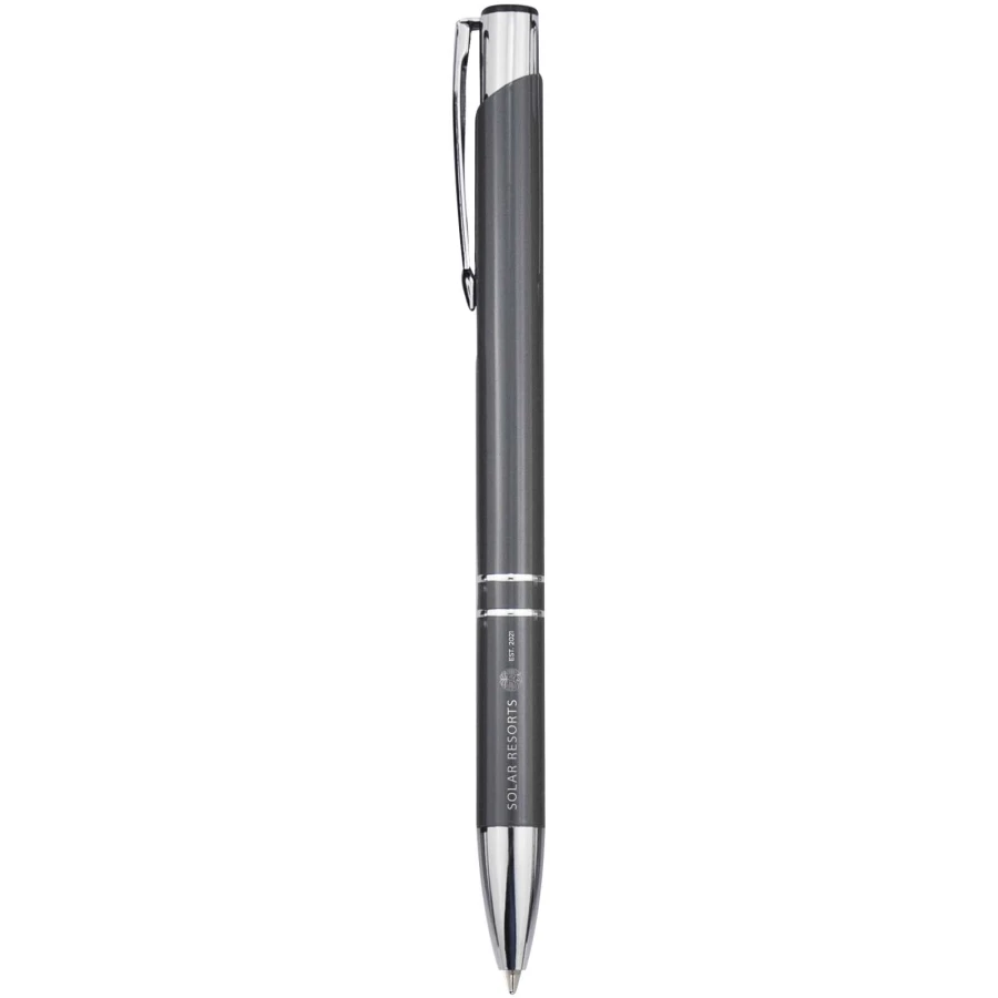 Długopis wykonany z aluminium z recyklingu z lakierowanym wykończeniem, połyskiem i wyrazistymi chromowanymi detalami. Aluminium z recyklingu ogranicza ilość odpadów na wysypiskach śmieci i pomaga chronić zasoby naturalne w celu zmniejszenia emisji gazów cieplarnianych. Kolor tuszu: Niebieski. Żywotność: 1000 metrów. Rozmiar stalówki: 1,00 mm.