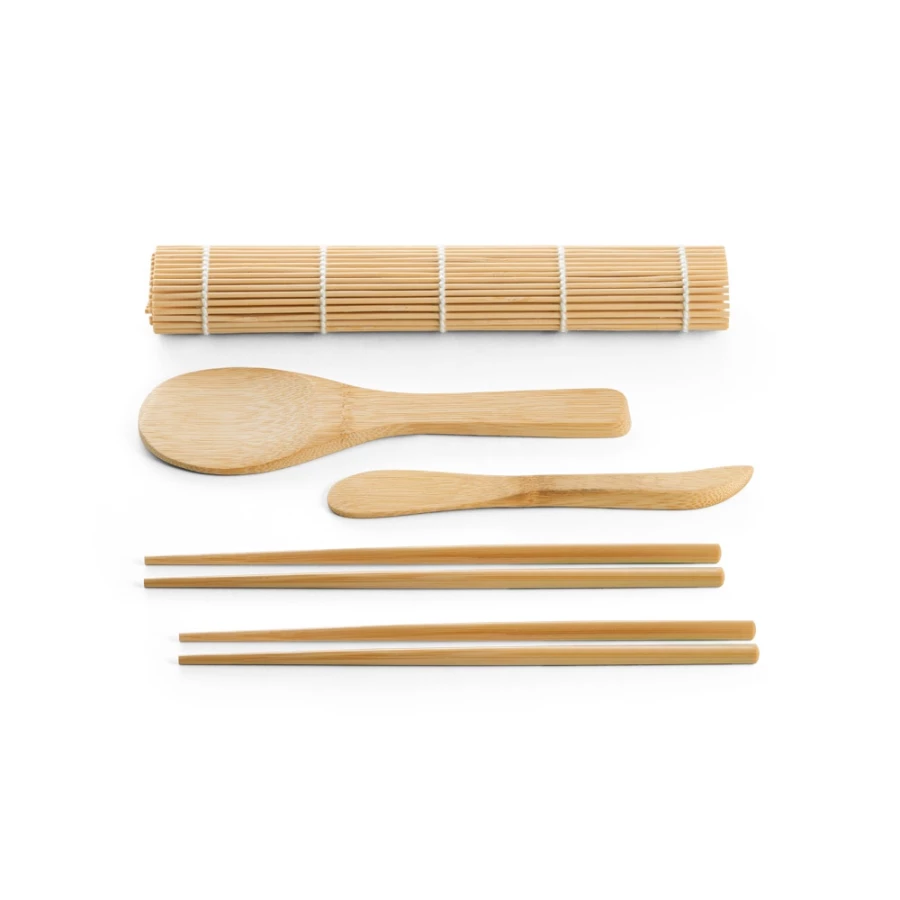 Bambusowy zestaw do sushi - bambusowa mata, 2 pary pałeczek, 1 łyżka i 1 nóż. Dostarczany w pudełku upominkowym z papieru kraft. Ponieważ produkt jest wykonany z naturalnych materiałów, kolor produktu oraz wynik drukowania mogą się różnić w zależności od produktu. Pudełko: 245 x 100 x 33 mm