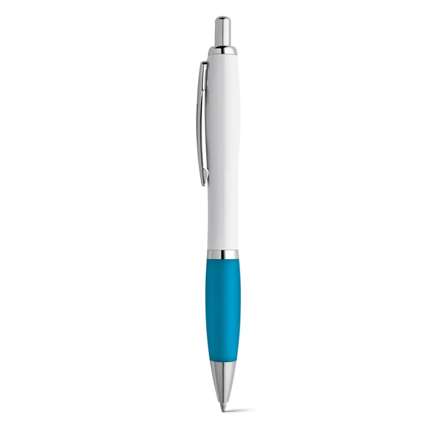 Biały długopis wykonany z ABS z metalowym klipem i kolorowym elementem z antypoślizgiem. Dostępny w szerokiej gamie kolorów. Czarny tusz. ø12 x 140 mm