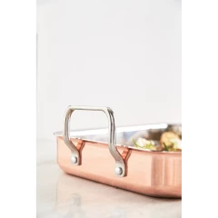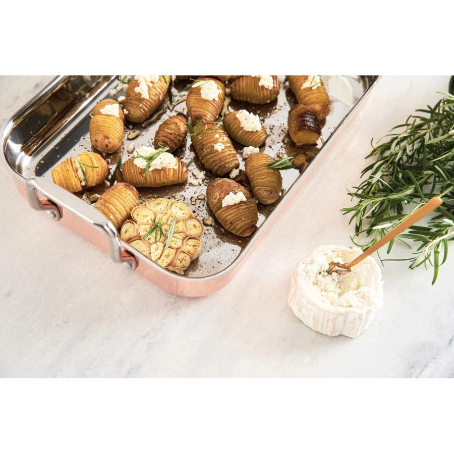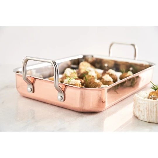Naczynie do zapiekania, trójwarstwowa konstrukcja, na zewnątrz warstwa miedzi, wewnątrz aluminium i stal nierdzewna, szybkie i równomierne nagrzewanie