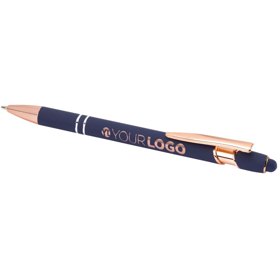 Długopis Nanna z wykończeniem w kolorze różowego złota ma korpus wykonany z aluminium z recyklingu i rysik dotykowy wykonany z silikonu. Aluminium z recyklingu ogranicza ilość odpadów na wysypiskach śmieci i pomaga chronić zasoby naturalne w celu zmniejszenia emisji gazów cieplarnianych. Kolor tuszu: Czarny. Żywotność: 800 metrów. Rozmiar stalówki: 1,0 mm.