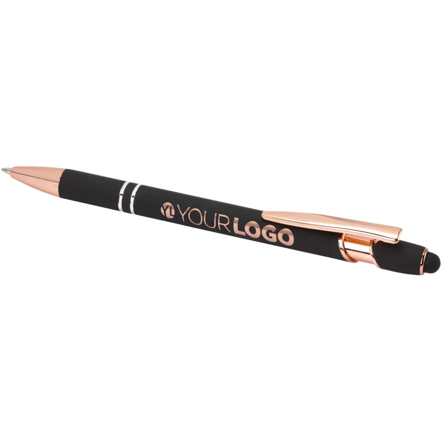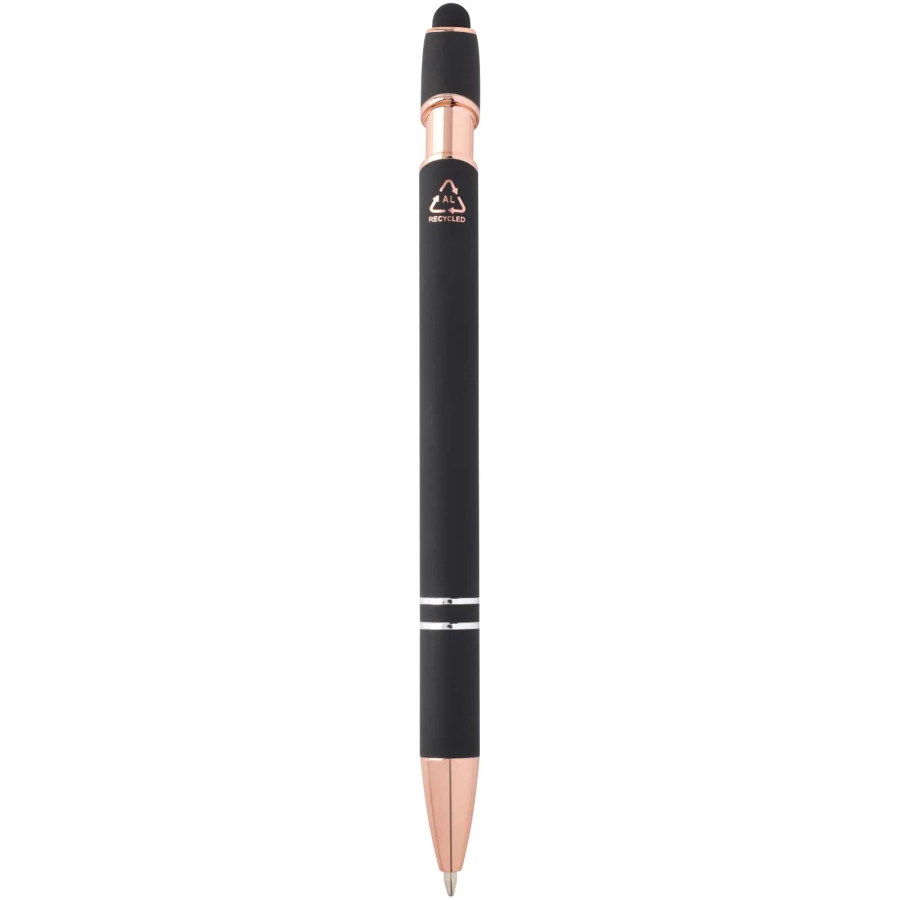 Długopis Nanna z wykończeniem w kolorze różowego złota ma korpus wykonany z aluminium z recyklingu i rysik dotykowy wykonany z silikonu. Aluminium z recyklingu ogranicza ilość odpadów na wysypiskach śmieci i pomaga chronić zasoby naturalne w celu zmniejszenia emisji gazów cieplarnianych. Kolor tuszu: Czarny. Żywotność: 800 metrów. Rozmiar stalówki: 1,0 mm.