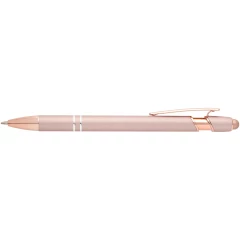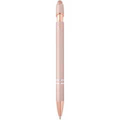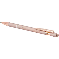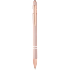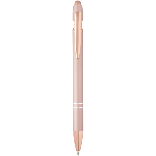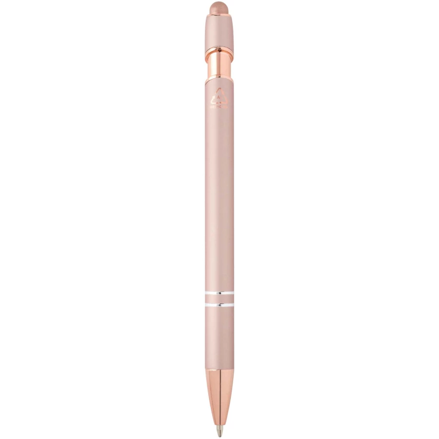 Długopis Nanna z wykończeniem w kolorze różowego złota ma korpus wykonany z aluminium z recyklingu i rysik dotykowy wykonany z silikonu. Aluminium z recyklingu ogranicza ilość odpadów na wysypiskach śmieci i pomaga chronić zasoby naturalne w celu zmniejszenia emisji gazów cieplarnianych. Kolor tuszu: Niebieski. Żywotność: 800 metrów. Rozmiar stalówki: 1,0 mm.