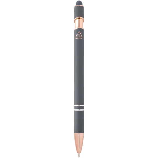 Długopis Nanna z wykończeniem w kolorze różowego złota ma korpus wykonany z aluminium z recyklingu i rysik dotykowy wykonany z silikonu. Aluminium z recyklingu ogranicza ilość odpadów na wysypiskach śmieci i pomaga chronić zasoby naturalne w celu zmniejszenia emisji gazów cieplarnianych. Kolor tuszu: Niebieski. Żywotność: 800 metrów. Rozmiar stalówki: 1,0 mm.