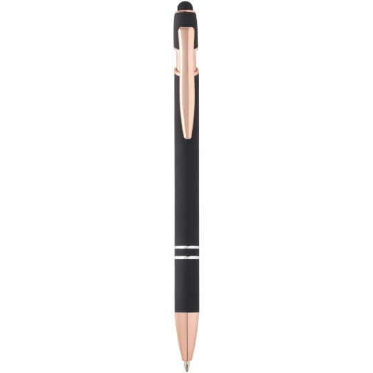 Długopis Nanna z wykończeniem w kolorze różowego złota ma korpus wykonany z aluminium z recyklingu i rysik dotykowy wykonany z silikonu. Aluminium z recyklingu ogranicza ilość odpadów na wysypiskach śmieci i pomaga chronić zasoby naturalne w celu zmniejszenia emisji gazów cieplarnianych. Kolor tuszu: Niebieski. Żywotność: 800 metrów. Rozmiar stalówki: 1,0 mm.