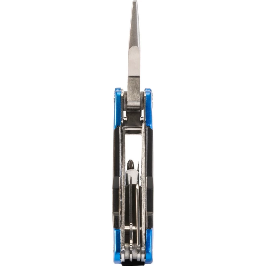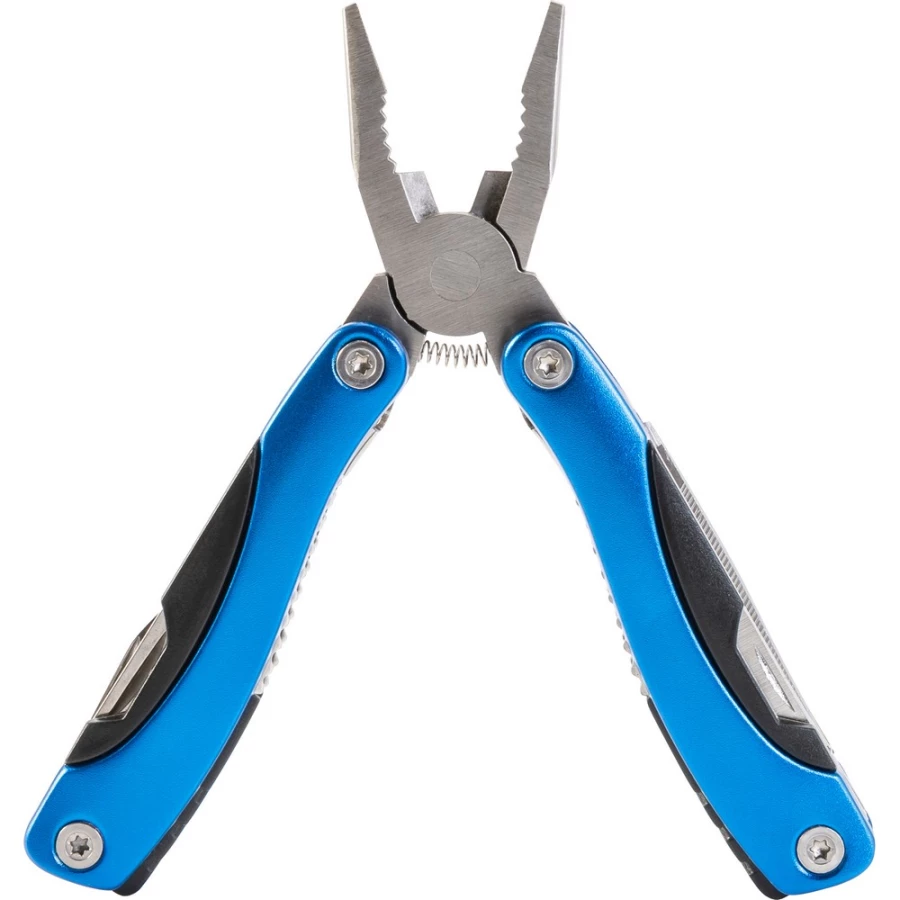 Narzędzie wielofunkcyjne, 10 funkcji: kombinerki, piła, nóż, 2 śrubokręty (płaski i krzyżakowy), pilnik, otwieracz do butelek, skrobak do ryb, dziadek do orzechów, linijka (w calach), w pokrowcu