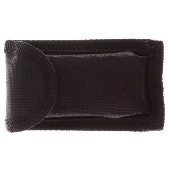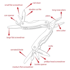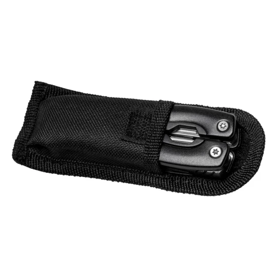 Narzędzie wielofunkcyjne w czarnym pokrowcu, posiada 12 funkcji oraz kolorowy uchwyt z czarnymi elementami, produkt wykonany z aluminium i stali nierdzewnej