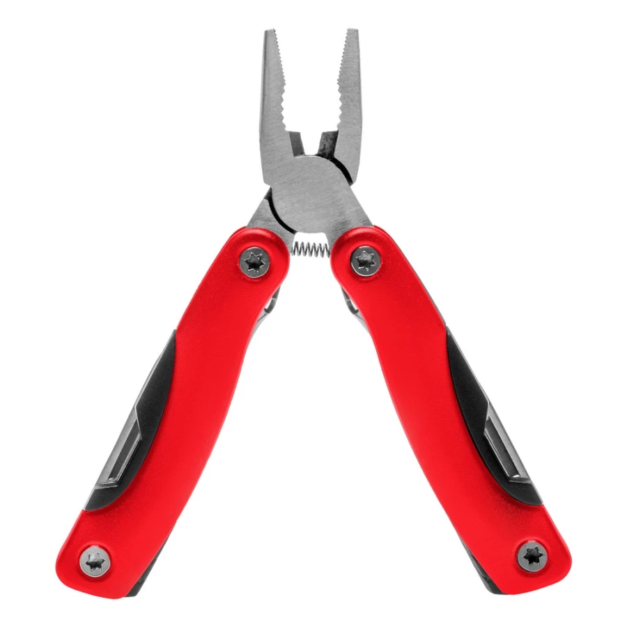 Narzędzie wielofunkcyjne w czarnym pokrowcu, posiada 12 funkcji oraz kolorowy uchwyt z czarnymi elementami, produkt wykonany z aluminium i stali nierdzewnej