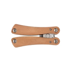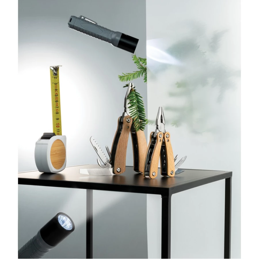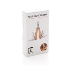 Trwałe i wytrzymałe narzędzie wielofunkcyjne, wykonane z wysokiej jakości stali nierdzewnej, uchwyt z drewna bukowego, 13 funkcji: długie szczypce, kombinerki, przecinak do kabli i drutu, ostrze ząbkowane, otwieracz do butelek, duży śrubokręt płaski, śrubokręt krzyżakowy, nóż, piła, mały śrubokręt płaski, otwieracz do puszek, średni śrubokręt płaski, pilnik, w ozdobnym pudełku, ślad węglowy produktu: 1,01 kg CO2