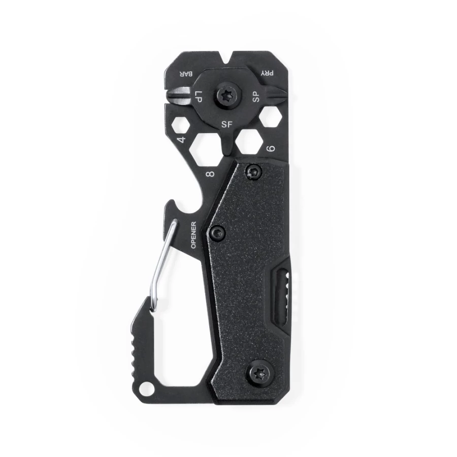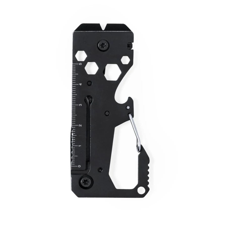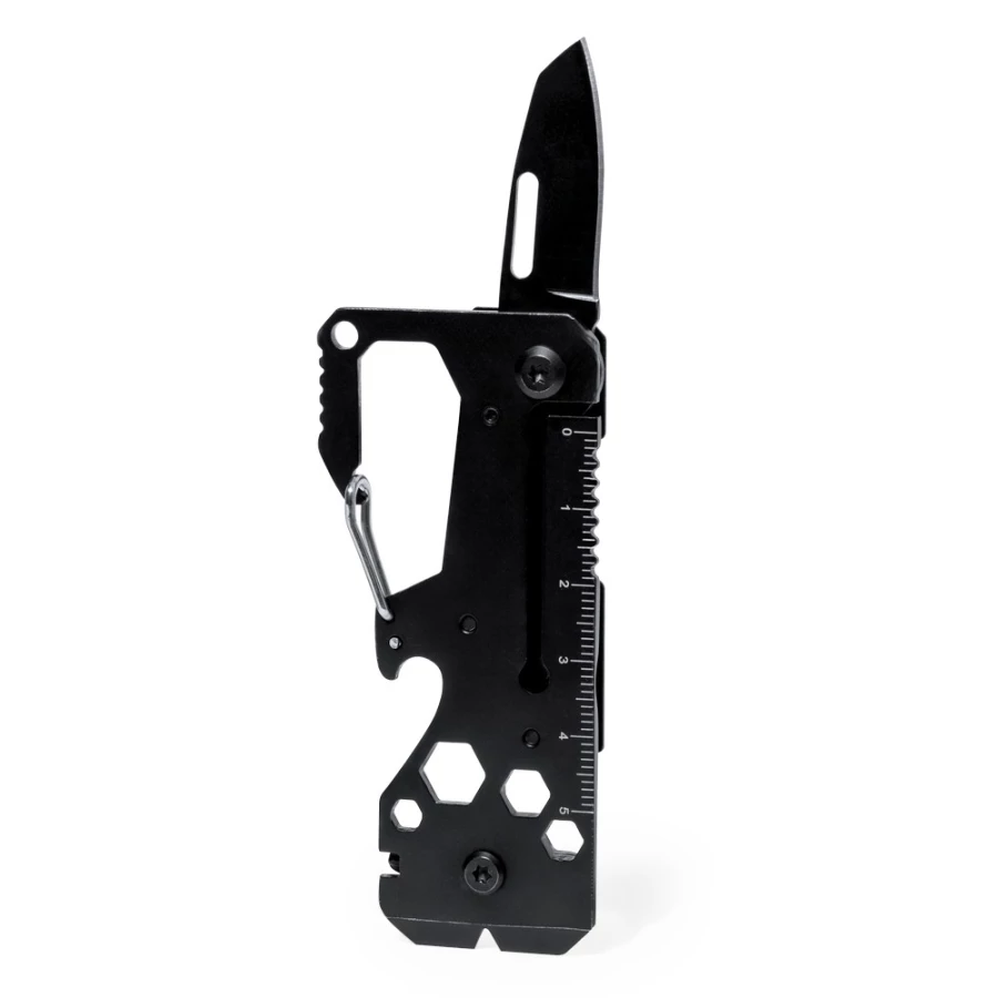 Narzędzie wielofunkcyjne, 13 funkcji, linijka, noże, piła, klucze imbusowe, końcówki do śrubokrętu, karabińczyk, otwieracz do puszek