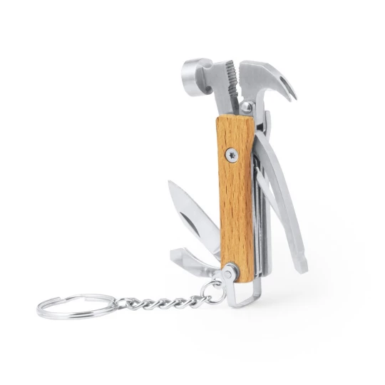 Narzędzie wielofunkcyjne z drewnianym uchwytem, brelok do kluczy, 7 funkcji: młotek, szczypce, mały płaski śrubokręt, nóż, ściągacz izolacji, pilnik i otwieracz do butelek