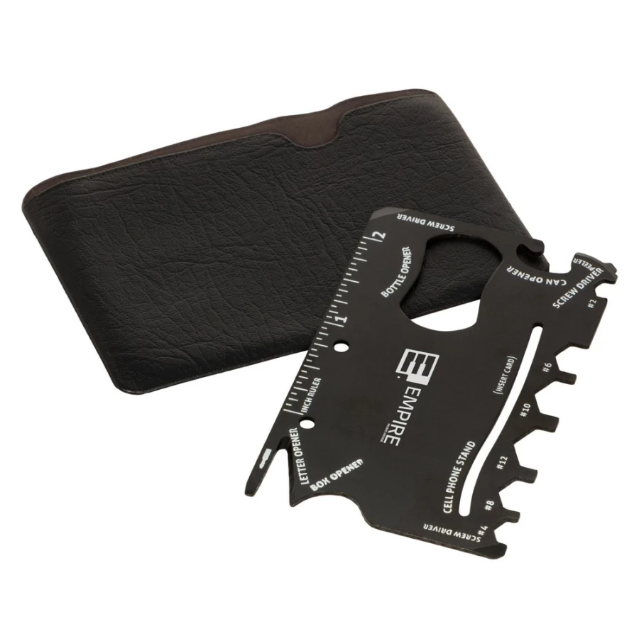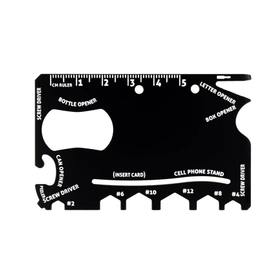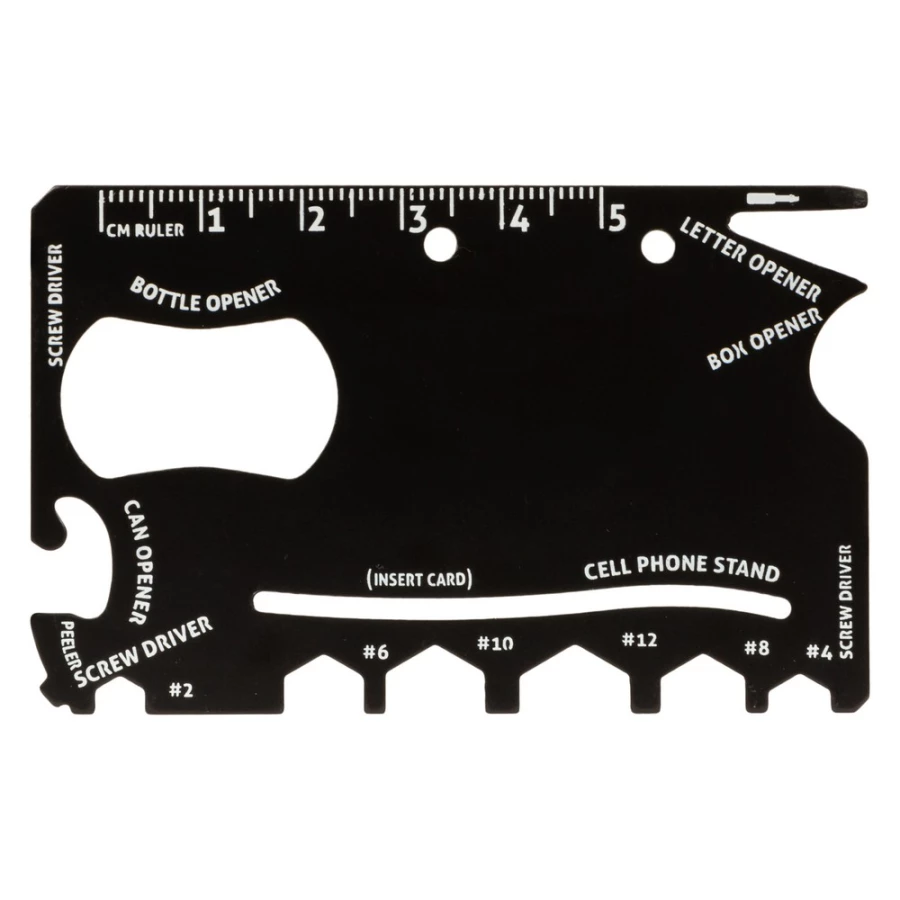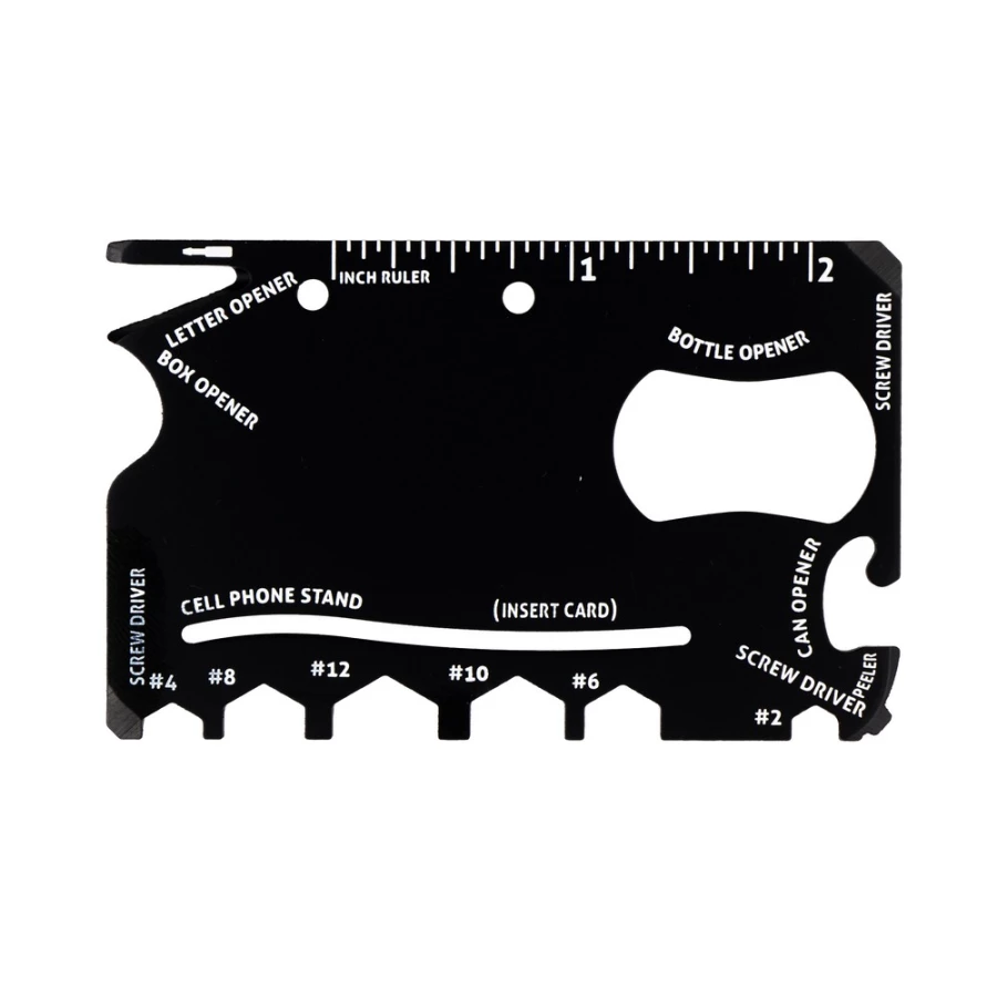 Narzędzie wielofunkcyjne w etui, posiada 9 funkcji: linijka (5 cm / 2 cale), mini wkrętak, otwieracz do kartonu, 2x wkrętak, klucze płaskie (#2, #4, #6, #8, #10, #12), podstawka pod telefon (karta nie jest dołączona), otwieracz do puszek, otwieracz do butelek, produkt wykonany ze stali nierdzewnej