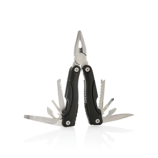 Narzędzie wielofunkcyjne, wykonane z aluminium, uchwyt z czarnymi detalami, 14 funkcji, czarny pokrowiec 600D w komplecie, ślad węglowy produktu: 2,53 kg CO2