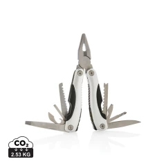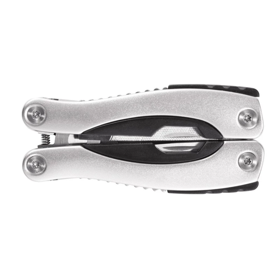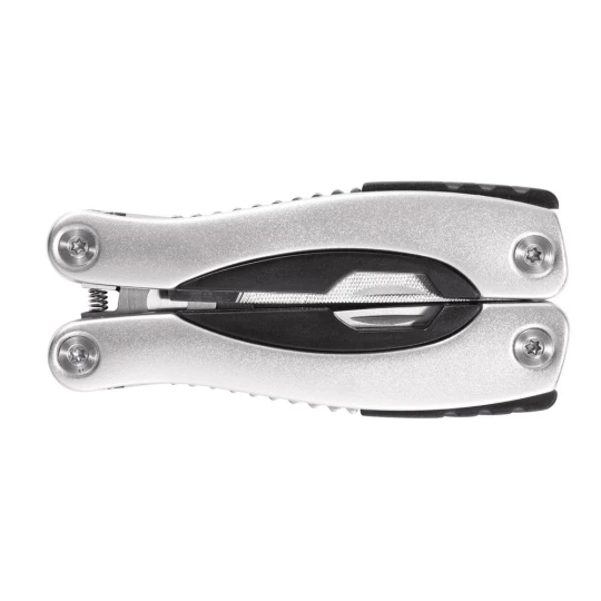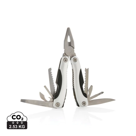 Narzędzie wielofunkcyjne, wykonane z aluminium, uchwyt z czarnymi detalami, 14 funkcji, czarny pokrowiec 600D w komplecie, ślad węglowy produktu: 2,53 kg CO2