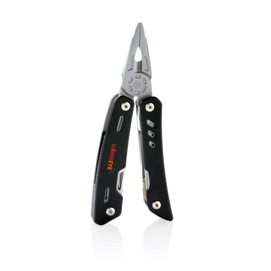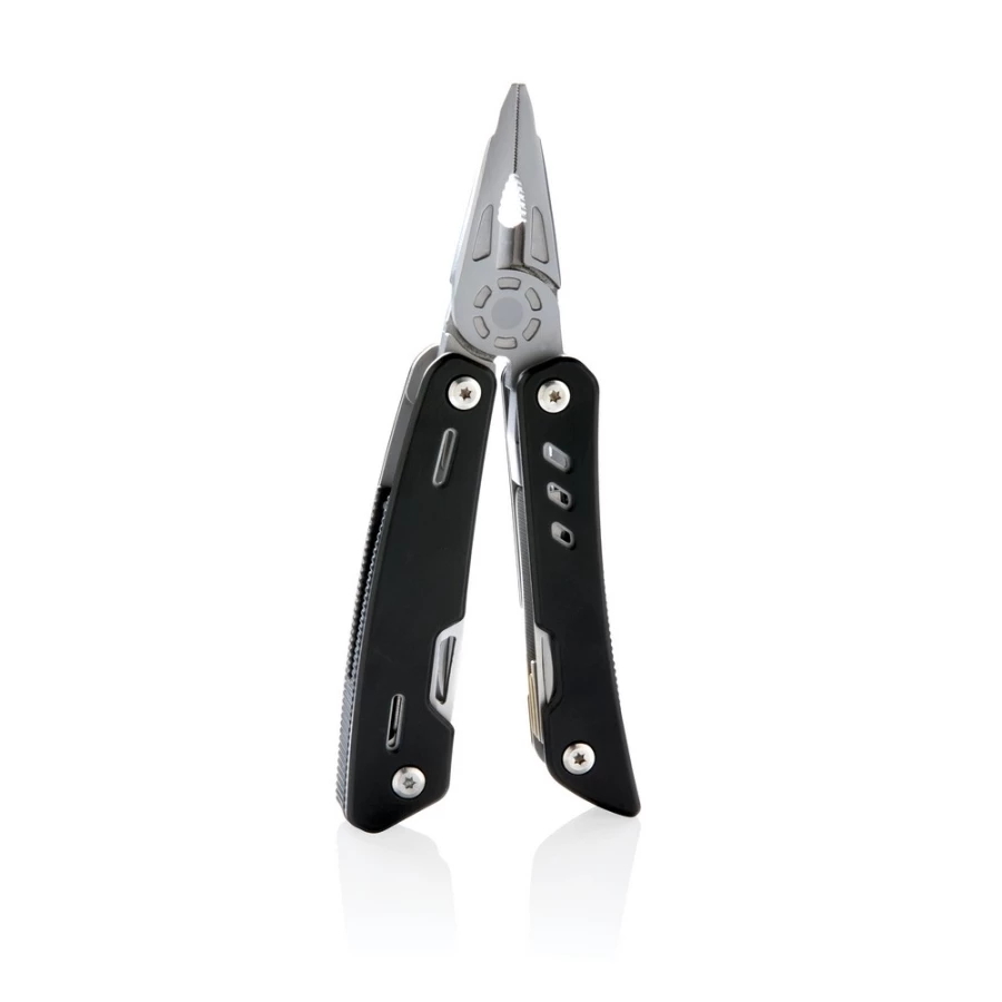 Narzędzie wielofunkcyjne, trwałe i wytrzymałe, wykonane ze stali nierdzewnej, aluminiowy uchwyt, 12 funkcji: szczypce, kombinerki, przecinak do kabli i drutu, nóż, śrubokręt krzyżakowy, mały śrubokręt płaski, piła, otwieracz do puszek, otwieracz do butelek, ostrze ząbkowane, szpikulec, pilnik i duży śrubokręt płaski, w ozdobnym pudełku, ślad węglowy produktu: 2,75 kg CO2
