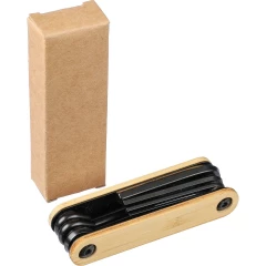 Narzędzie wielofunkcyjne, 7 funkcji: 5 kluczy imbusowych, śrubokręt krzyżakowy, śrubokręt płaski, zapakowane w brązowy kartonik, produkt wykonany z metalu i bambusa