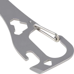 Narzędzie wielofunkcyjne zawiera: łyżkę, widelec, otwieracz do puszek i butelek, płaski śrubokręt, trzy klucze imbusowe, karabińczyk ułatwiający przypięcie, zapakowany pojedynczo w papierowe pudełko, produkt wykonany ze stali nierdzewnej 430