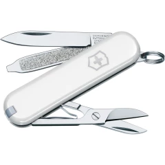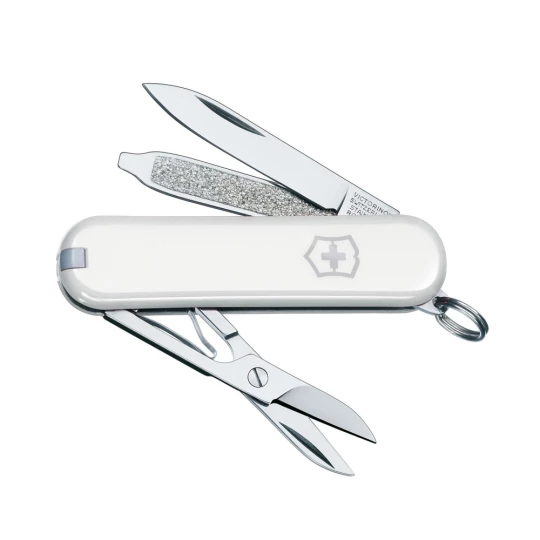 Narzędzie wielofunkcyjne Victorinox Classic SD z 7 funkcjami: wykałaczką, nożyczkami, pęsetą, pilnikiem do paznokci, śrubokrętem (2,5 mm), brelokiem do kluczy i małym ostrzem, zapakowane w pudełko upominkowe, produkt wykonany z ABS i metalu