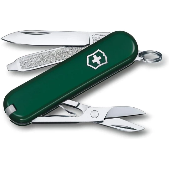 Narzędzie wielofunkcyjne Victorinox Classic SD z 7 funkcjami: wykałaczką, nożyczkami, pęsetą, pilnikiem do paznokci, śrubokrętem (2,5 mm), brelokiem do kluczy i małym ostrzem, zapakowane w pudełko upominkowe, produkt wykonany z ABS i metalu