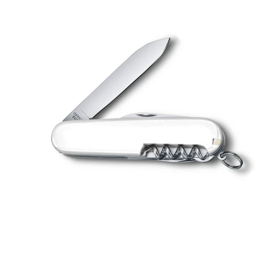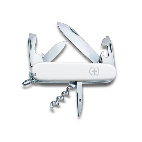 Narzędzie wielofunkcyjne Victorinox Spartan z 12 funkcjami: pęseta, małe i duże ostrze, brelok, otwieracz do puszek, śrubokręty (3 i 6 mm), korkociąg, wykałaczka, otwieracz do butelek, ściągacz izolacji oraz rozwiertak, przebijak i szydło, zapakowane w pudełko upominkowe, produkt wykonany z metalu i stali nierdzewnej