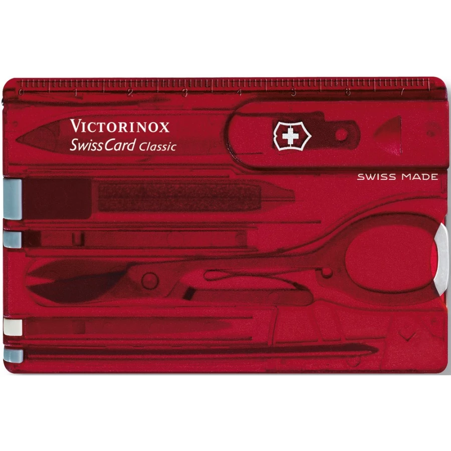 Narzędzie wielofunkcyjne Victorinox SwissCard Classic, w zestawie: nożyk do listów, pęseta, nożyczki, pilnik do paznokci, wykałaczka, długopis i stalowa szpilka, zapakowane pojedynczo w pudełko upominkowe, produkt wykonany ze stali nierdzewnej i plastiku