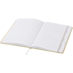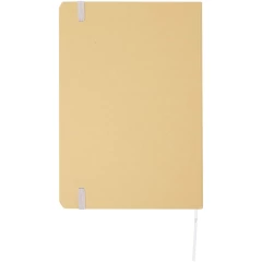 Notatnik A5 w twardej oprawie, wykonany z kartonu pochodzącego z recyklingu, zawierający 80 kartek w linie o gramaturze papieru 70 g/m². Notatnik posiada elastyczne zamknięcie, wstążkę i zaokrąglone rogi.