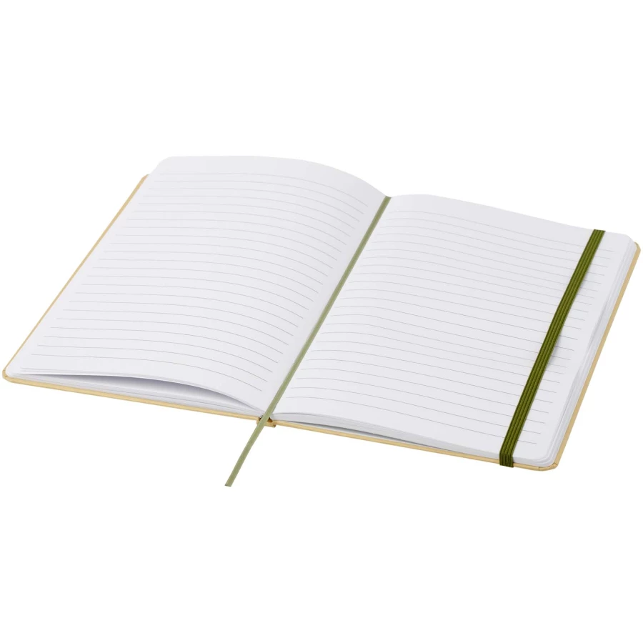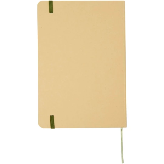 Notatnik A5 w twardej oprawie, wykonany z kartonu pochodzącego z recyklingu, zawierający 80 kartek w linie o gramaturze papieru 70 g/m². Notatnik posiada elastyczne zamknięcie, wstążkę i zaokrąglone rogi.