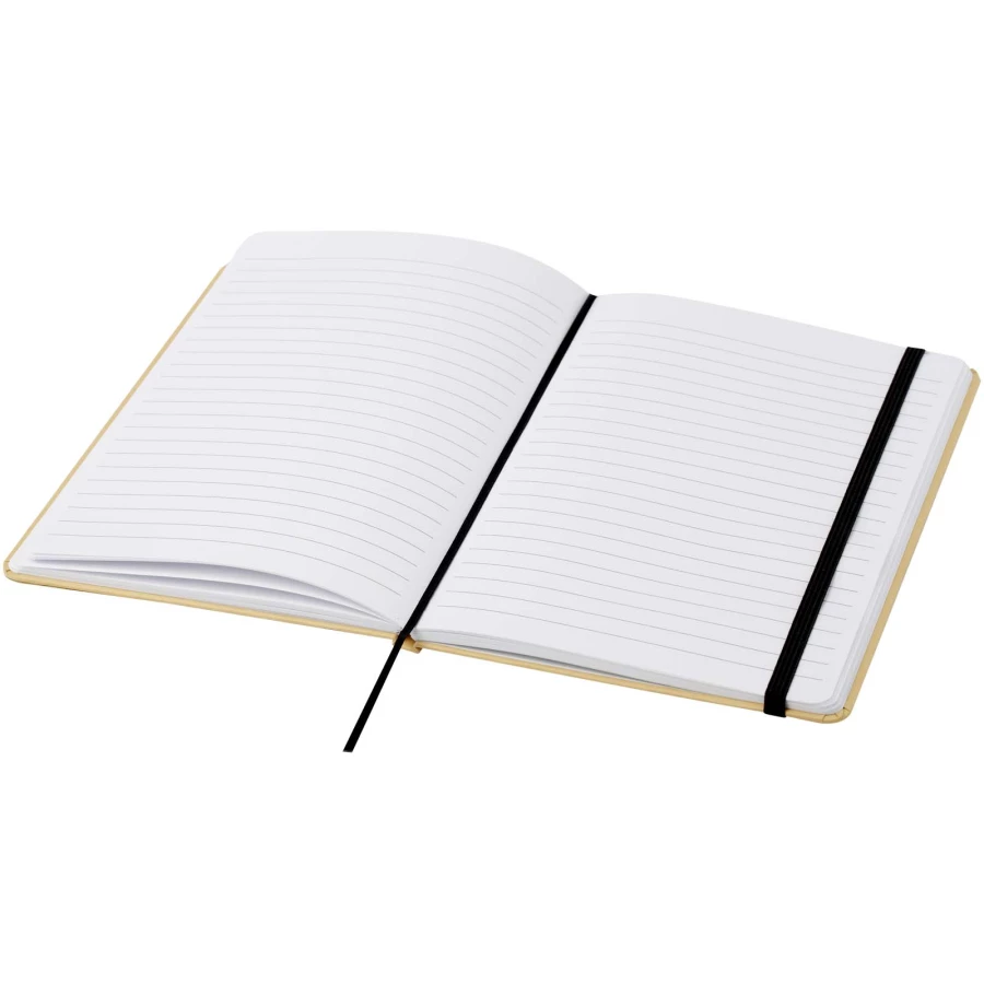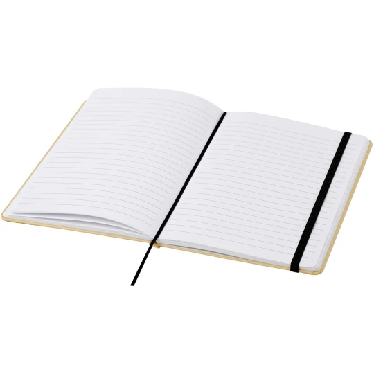 Notatnik A5 w twardej oprawie, wykonany z kartonu pochodzącego z recyklingu, zawierający 80 kartek w linie o gramaturze papieru 70 g/m². Notatnik posiada elastyczne zamknięcie, wstążkę i zaokrąglone rogi.