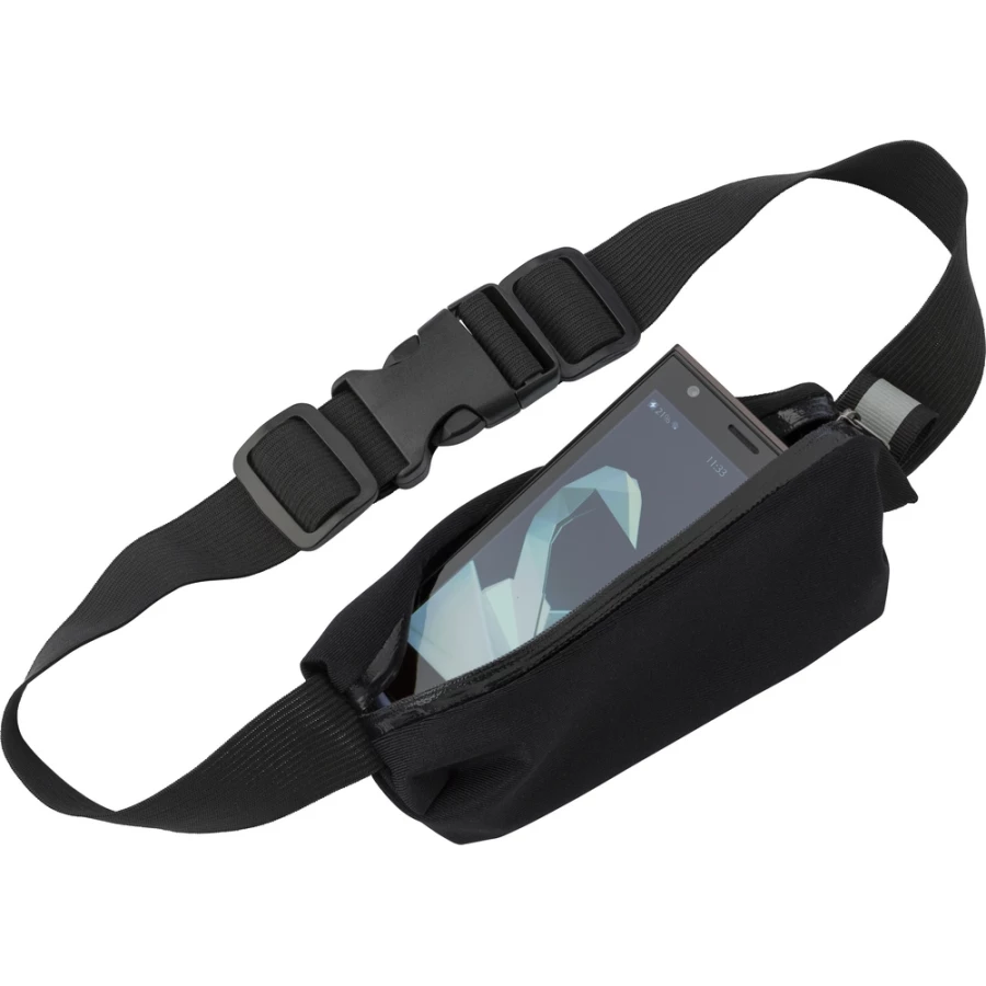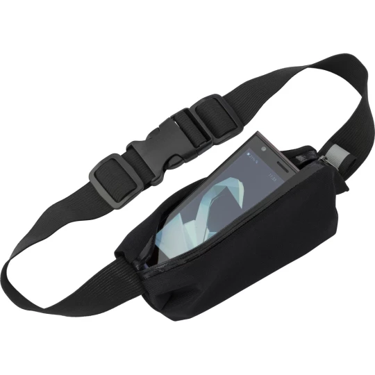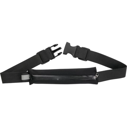 Nieprzemakalna saszetka zapinana w pasie na zamek, regulowany gumowy pasek z obu stron (2 x 27 cm) z plastikowym zapięciem, min. obwód ok. 62 cm, max. obwód ok. 93 cm (plus rozciągnięcie)