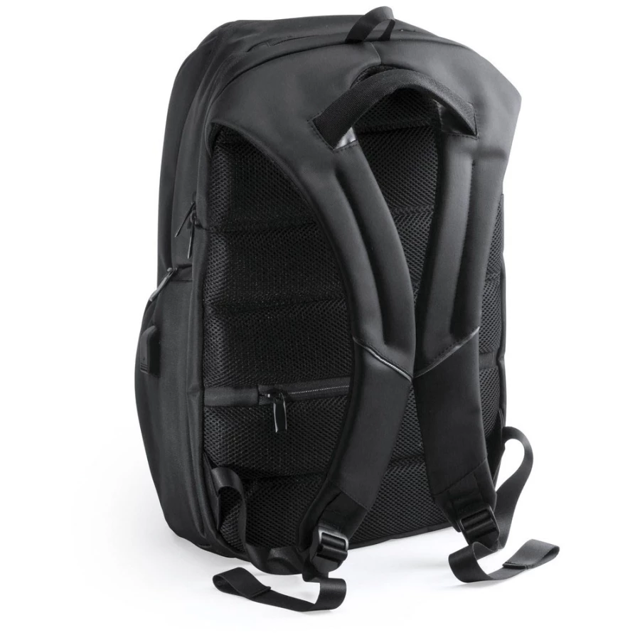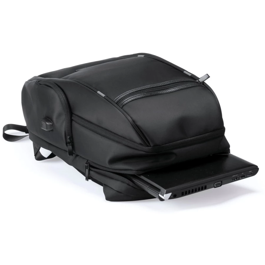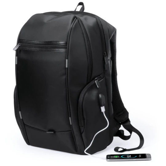 Nieprzemakalny plecak, miękka przegroda na laptopa 15", gniazdo USB do ładowania telefonów (power-bank nie jest dołączony), kabel micro USB w komplecie, przednia kieszeń zamykana na zamek, miękki tył i paski na ramię
