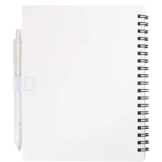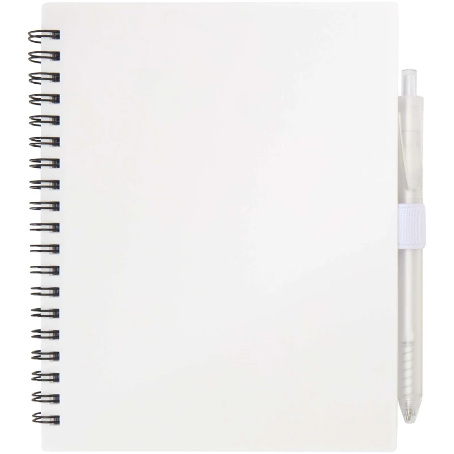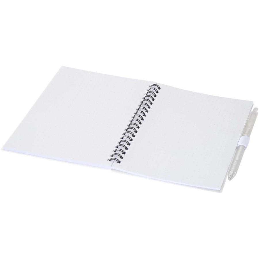 Notatnik z miękką okładką Niove wykonany z tworzyw sztucznych pochodzących z recyklingu i zawierający 70 kartek w kropki o gramaturze 70 g/m². Notatnik ma ostre rogi i wsuwkę na długopis. Rozmiar notatnika: 140 x 178 mm. Długopis również jest wykonany z plastiku pochodzącego z recyklingu. Kolor tuszu: Niebieski. Wydajność: 800 metrów. Grubość linii: 1,0 mm.
