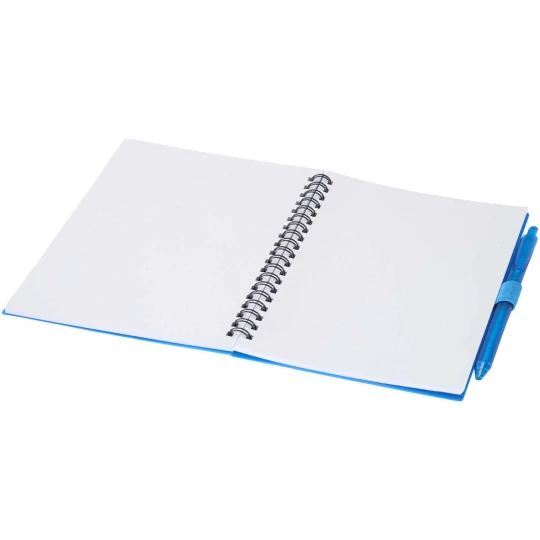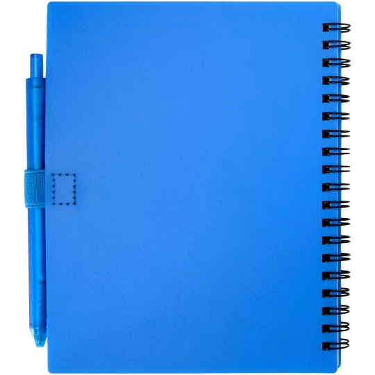 Notatnik z miękką okładką Niove wykonany z tworzyw sztucznych pochodzących z recyklingu i zawierający 70 kartek w kropki o gramaturze 70 g/m². Notatnik ma ostre rogi i wsuwkę na długopis. Rozmiar notatnika: 140 x 178 mm. Długopis również jest wykonany z plastiku pochodzącego z recyklingu. Kolor tuszu: Niebieski. Wydajność: 800 metrów. Grubość linii: 1,0 mm.