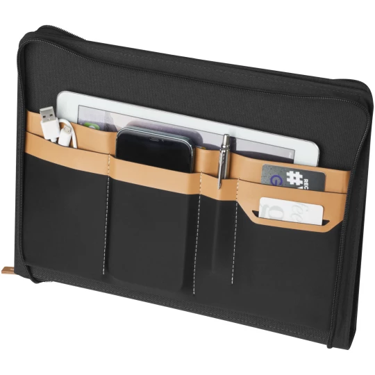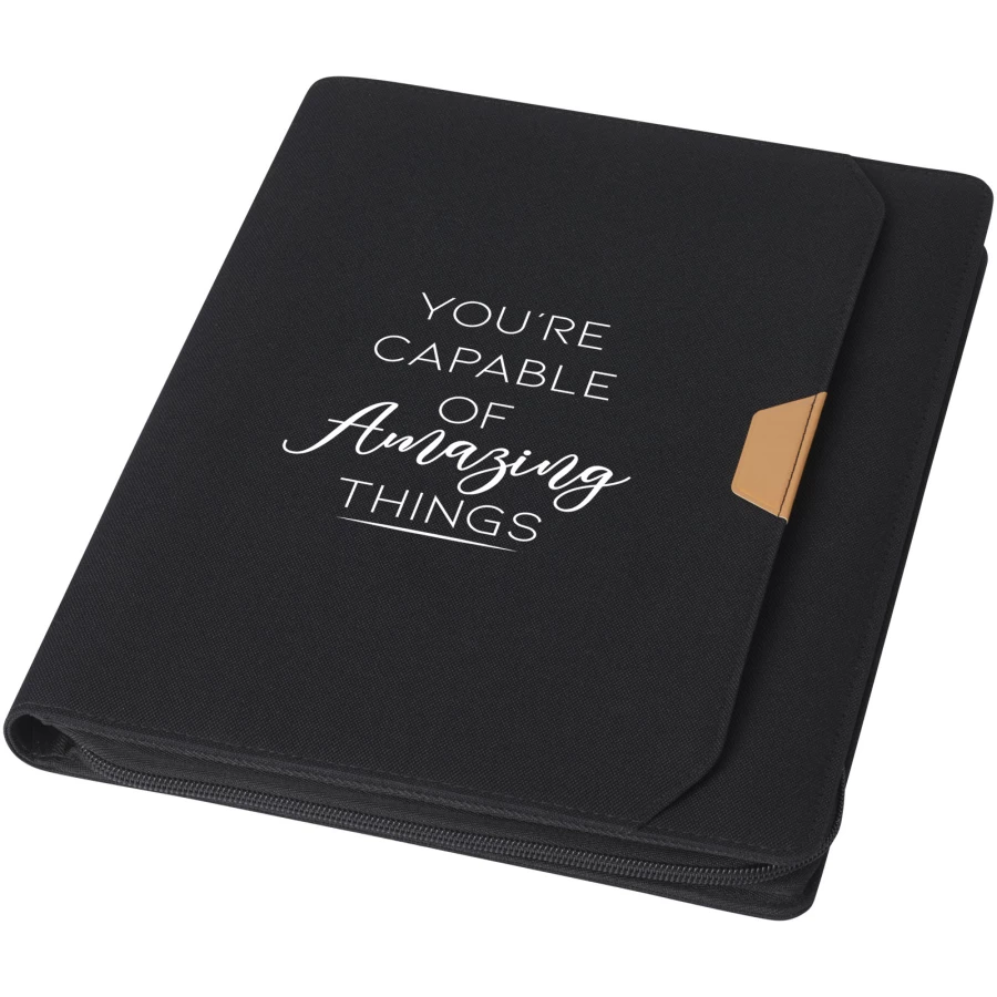 Nomumi teczka z notatnikiem do pisania częściowo wykonana z poużytkowego poliestru pochodzącego z recyklingu z certyfikatem RCS, co czyni ją bardziej zrównoważonym wyborem, ponieważ pomaga zmniejszyć zużycie pierwotnego surowca. Posiada zapięcie na zamek błyskawiczny, pętelkę na długopis, kieszeń harmonijkową i 20 białych kartek w linie z papieru z recyklingu o gramaturze 70 g/m2 pochodzącego ze zrównoważonych źródeł. Pióro i inne akcesoria widoczne na zdjęciach nie są dołączone do tego produktu.