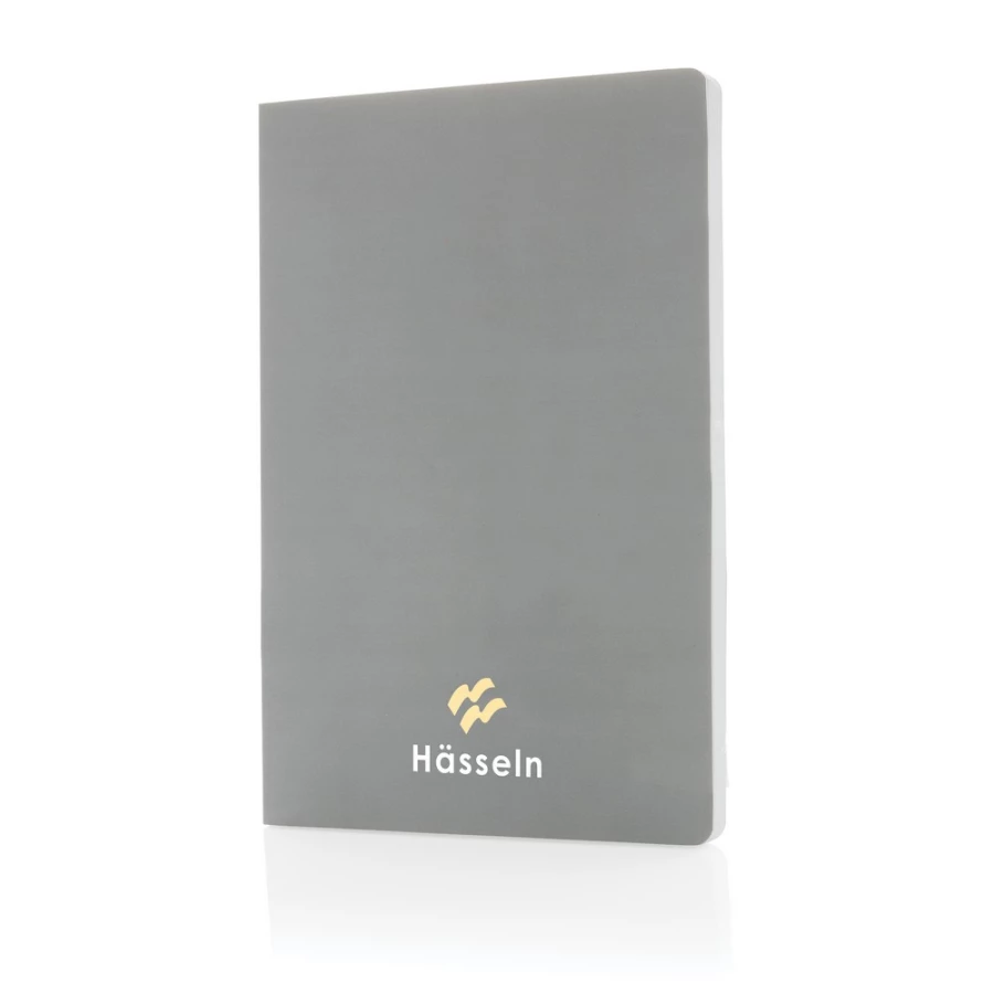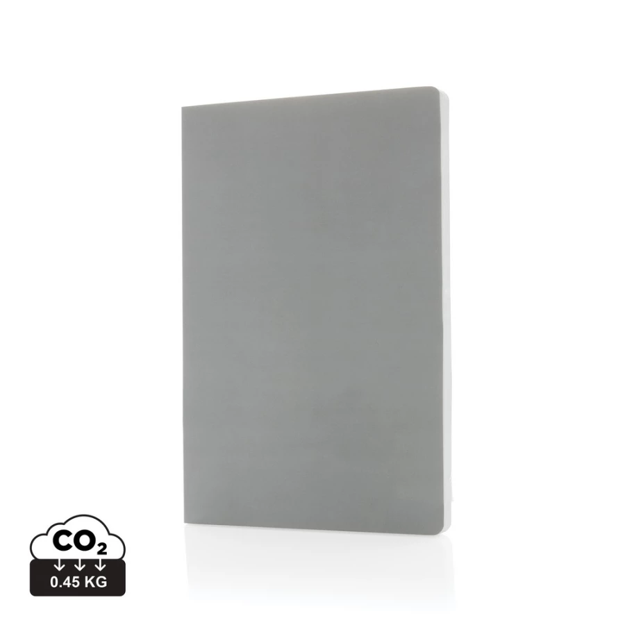 Notatnik A5 (60 białych kartek 58 g/m2 w linie), miękka okładka, notatnik wykonany z papieru kamiennego, który składa się w 80% z proszku mineralnego i 20% nietoksycznego HDPE (czysty plastik), 2% wpływów z każdego sprzedanego produktu z kolekcji Impact jest przekazywane na rzecz Water.org