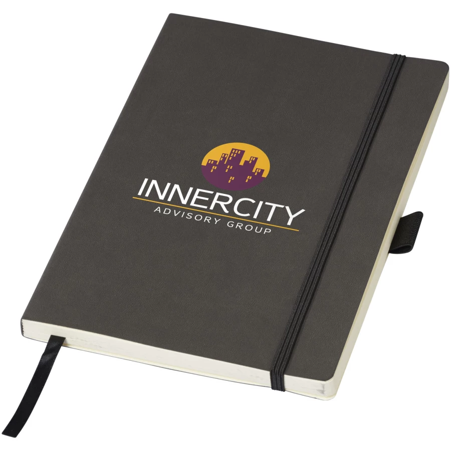 Elastyczny i miękki w dotyku notatnik (rozmiar A5) z wbudowanym elastycznym zamknięciem, wstążką, pętelką na długopis, kieszenią na dokumenty po wewnętrznej stronie okładki i 80 arkuszami (80 g) kremowego papieru w linię. Czarne opakowanie.