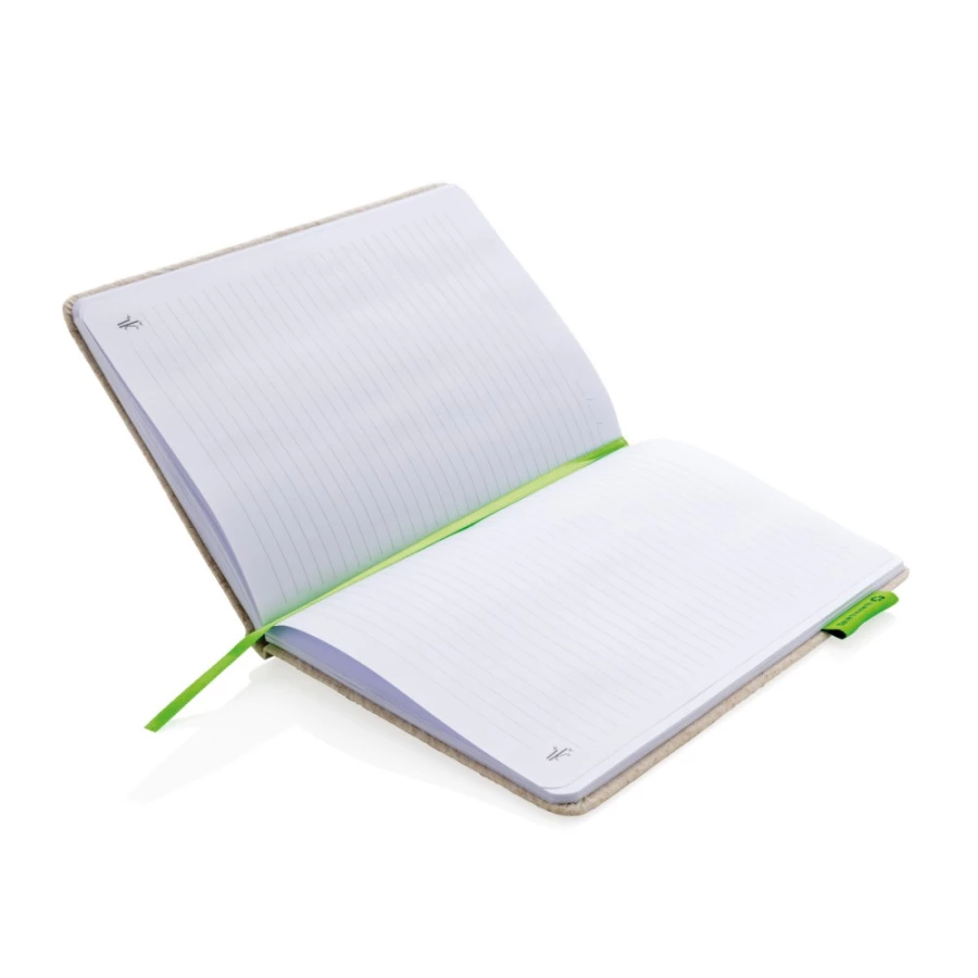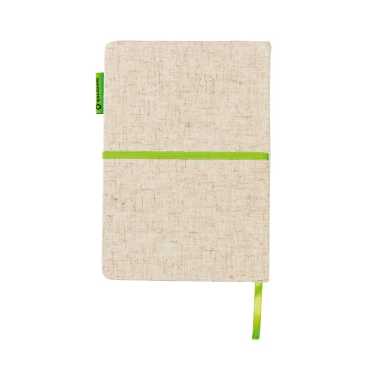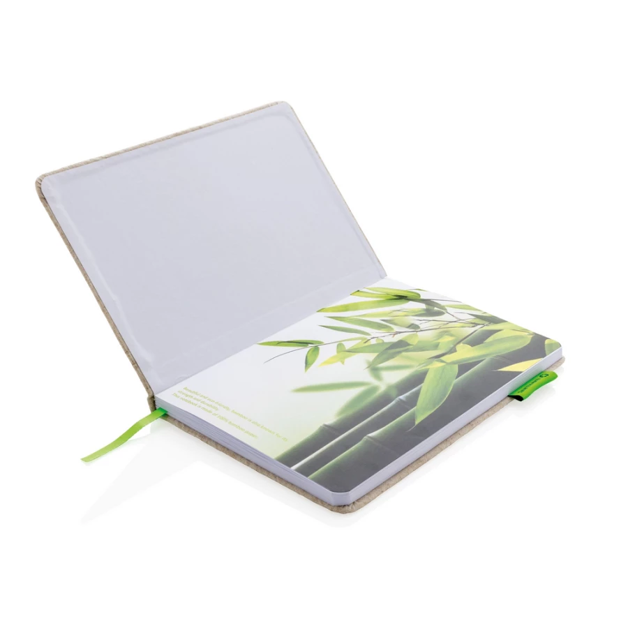 Notatnik A5 (80 kartek w linie z papieru z bambusa), okładka z juty, tasiemka zakładkowa i elastyczna opaska do zamykania, ślad węglowy produktu: 0,72 kg CO2