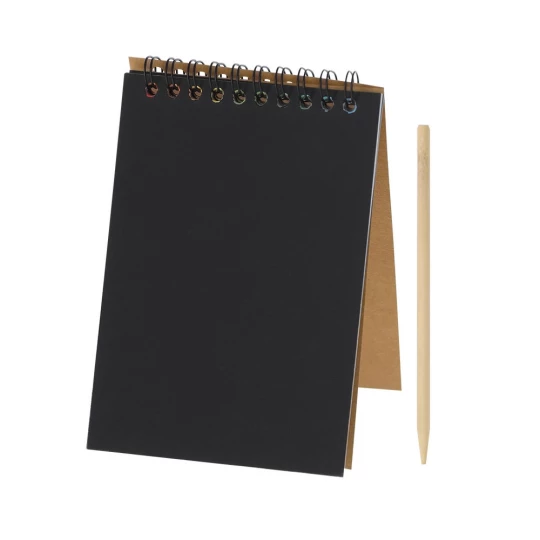 Notatnik do zdrapywania w formacie ok. A6 z miękką okładką, papier typu zdrapka, posiada 8 kartek w kolorze czarnym do zdrapywania oraz spiralne bindowanie, każda strona po zdrapaniu odkrywa tęczową, kolorową warstwę, bambusowy rysik do zdrapywania w komplecie, produkt wykonany z kartonu z recyklingu