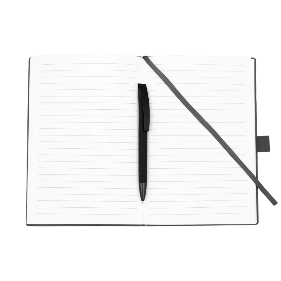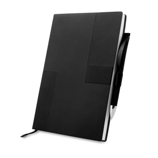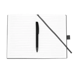 Notatnik w formacie ok. A5 posiada 80 kartek w linie (70 g/m²), tasiemka zakładkowa umożliwia wygodne zaznaczanie ostatniej strony lub ważniejszych notatek, w komplecie długopis typu "twist" z szerokim aluminiowym klipem przeznaczonym do grawerowania, przy szlufce na długopis znajduje się metalowa plakietka do grawerowania, twarda okładka wykonana z PU