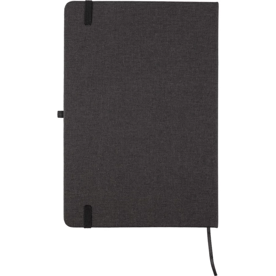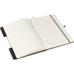 Notatnik ok. A5, posiada 80 stron w linie, tasiemka zakładkowa umożliwia wygodne zaznaczanie ostatniej strony lub ważniejszych notatek, dodatkowe zamknięcie w postaci dopasowanej kolorystycznie elastycznej opaski, składana okładka z bambusowym elementem zmienia się w stojak na telefon, zmieści się do szkolnego plecaka, produkt wykonany z RPET