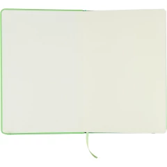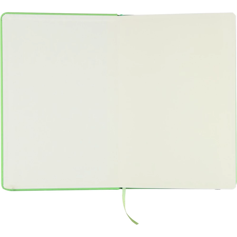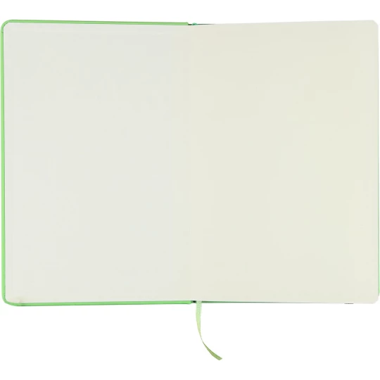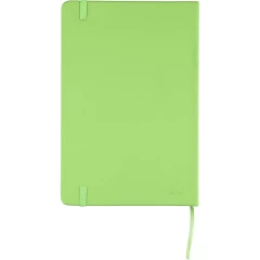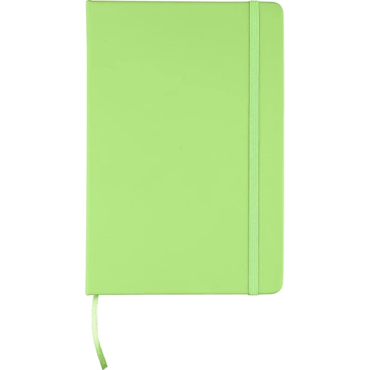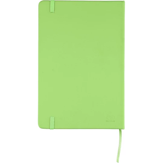 Notatnik ok. A5 RPET, z twardą okładką wykonaną z RPET PU, zawierający 80 stron w linie (70 g/m²), tasiemka zakładkowa umożliwia wygodne zaznaczanie ostatniej strony lub ważniejszych notatek, dodatkowe zamknięcie w postaci kolorowej elastycznej opaski, ikona recyklingu na tylnej stronie
