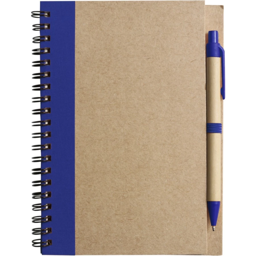 Notatnik w formacie ok. A5, posiada 60 kartek w linie (120 stron) i spiralne bindowanie, w komplecie znajduje się długopis z kolorowymi elementami, wkład w niebieskim kolorze, okładka wykonana z kartonu z kolorowym elementem przy bindowaniu