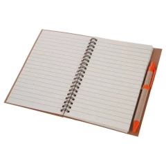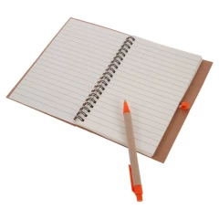 Notatnik w formacie ok. A5, posiada 60 kartek w linie (120 stron) i spiralne bindowanie, w komplecie znajduje się długopis z kolorowymi elementami, wkład w niebieskim kolorze, okładka wykonana z kartonu z kolorowym elementem przy bindowaniu