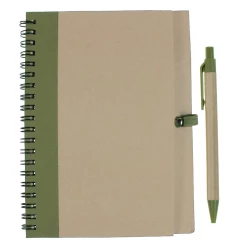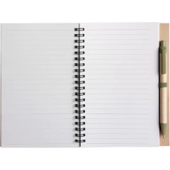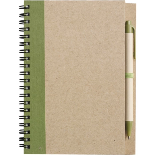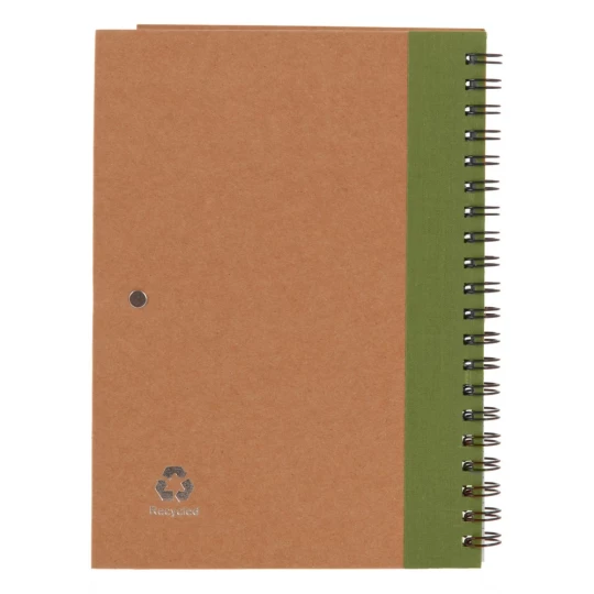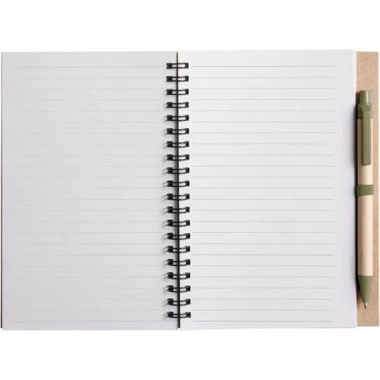 Notatnik w formacie ok. A5, posiada 60 kartek w linie (120 stron) i spiralne bindowanie, w komplecie znajduje się długopis z kolorowymi elementami, wkład w niebieskim kolorze, okładka wykonana z kartonu z kolorowym elementem przy bindowaniu