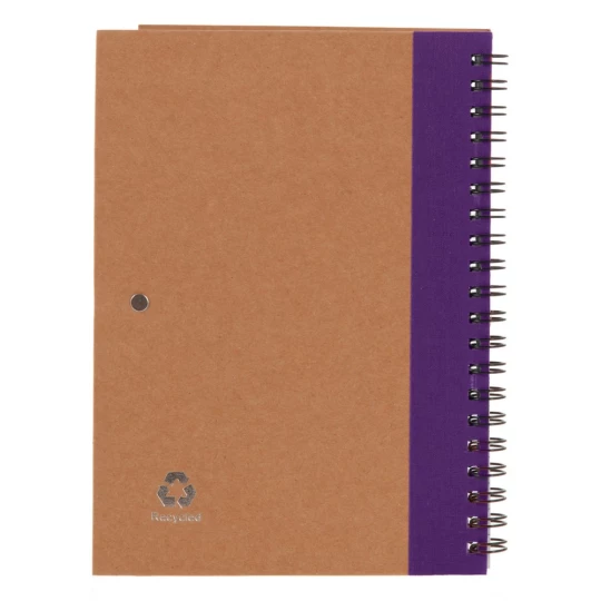 Notatnik w formacie ok. A5, posiada 60 kartek w linie (120 stron) i spiralne bindowanie, w komplecie znajduje się długopis z kolorowymi elementami, wkład w niebieskim kolorze, okładka wykonana z kartonu z kolorowym elementem przy bindowaniu
