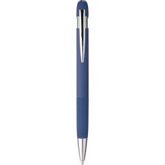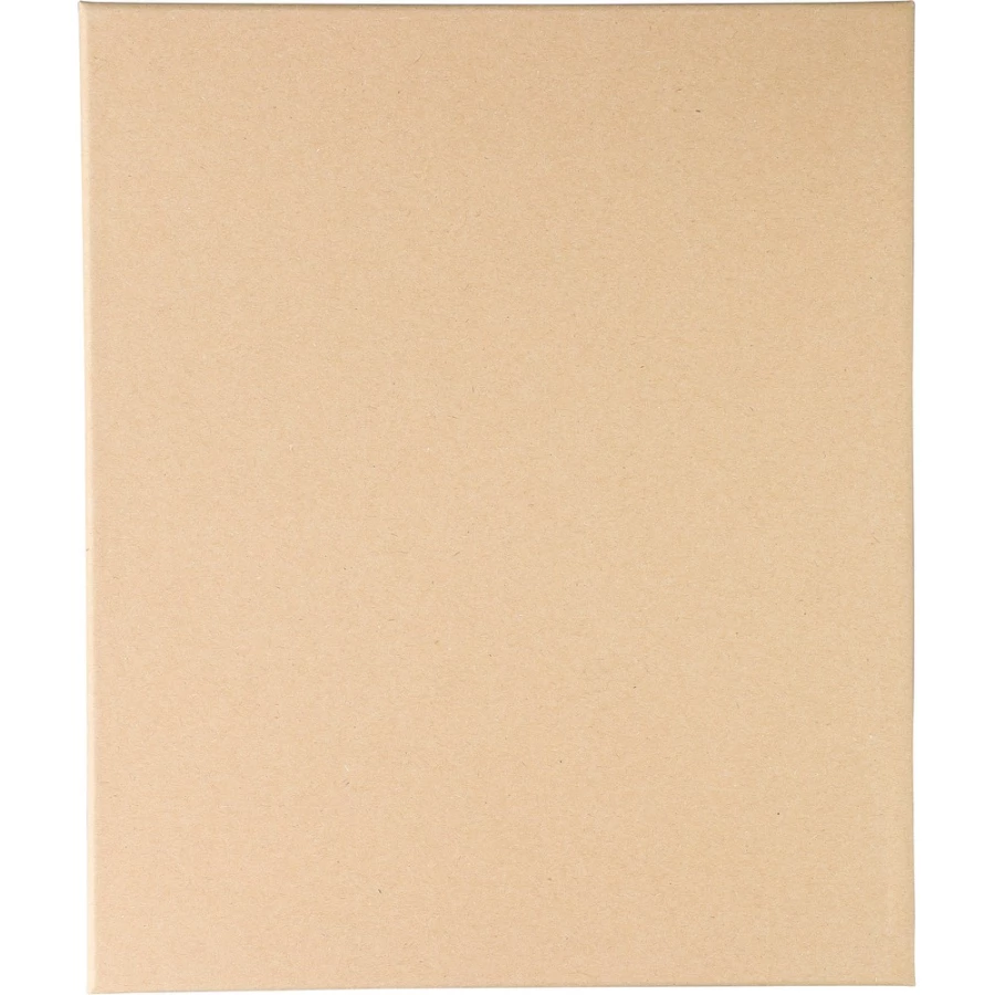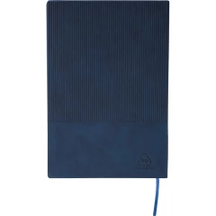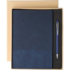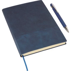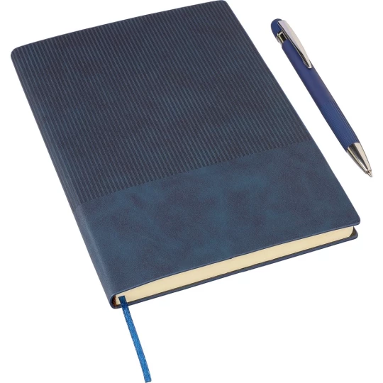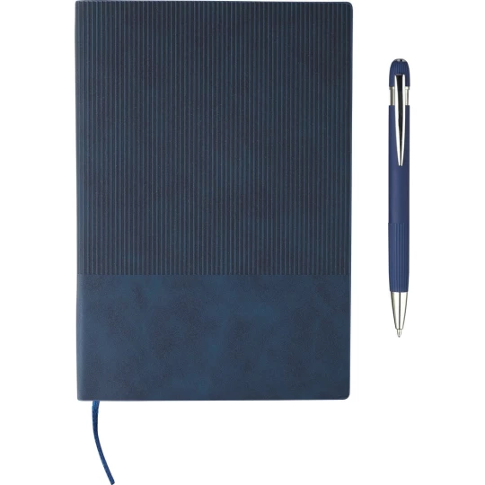 Notatnik ok A5, 100 stron w linie (70 g/m²) z twardą okładką przypominającą sztruks, tasiemka zakładkowa umożliwia wygodne zaznaczanie ostatniej strony lub ważniejszych notatek, długopis w komplecie, gumowe wykończenie, paskowane detale na trzonie i w górnej części, chromowana plastikowa końcówka, ikona recyklingu na obu produktach, zapakowane w brązowe kartonowe pudełko, produkt wykonany z PU i metalu