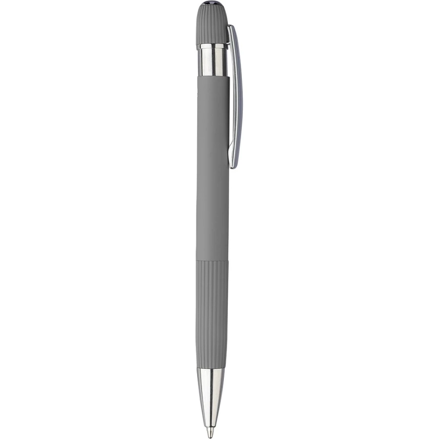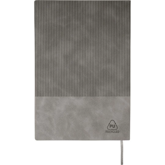 Notatnik ok A5, 100 stron w linie (70 g/m²) z twardą okładką przypominającą sztruks, tasiemka zakładkowa umożliwia wygodne zaznaczanie ostatniej strony lub ważniejszych notatek, długopis w komplecie, gumowe wykończenie, paskowane detale na trzonie i w górnej części, chromowana plastikowa końcówka, ikona recyklingu na obu produktach, zapakowane w brązowe kartonowe pudełko, produkt wykonany z PU i metalu