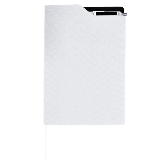 Notatnik ok. A5, posiada 80 kartek w linie, tasiemka zakładkowa umożliwia wygodne zaznaczanie ostatniej strony lub ważniejszych notatek, twarda okładka, długopis z wkładem w niebieskim kolorze, produkt wykonany z poliestru 300D