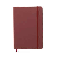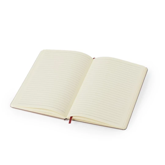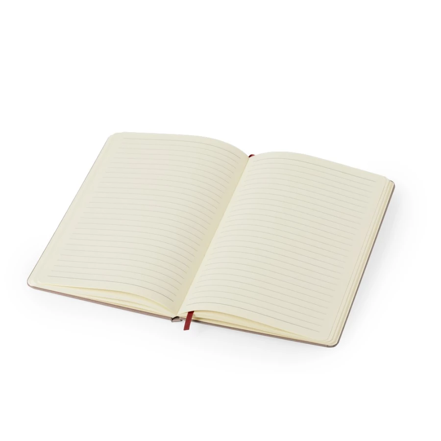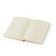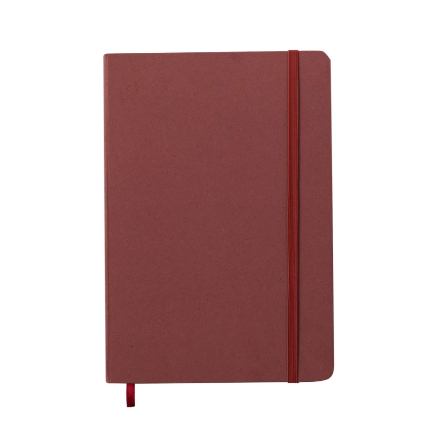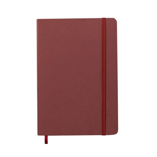 Notatnik A5 (80 kartek w linie), wykonany z kartonu z recyklingu i papieru z owoców, twarda okładka, tasiemka zakładkowa i elastyczna opaska do zamykania